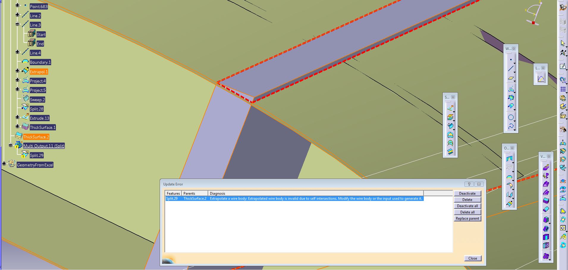 Hello, I'm currently designing an RC aircraft in CATIA V5R19. I've created the wing, ribs,spars as surfaces. I want them in solid and when I execute thick surface command things get messy because of the tapered wing. For example, I'm giving thickness to the front spar and the new solid is partly intersecting with the wing skin and I cannot split them.