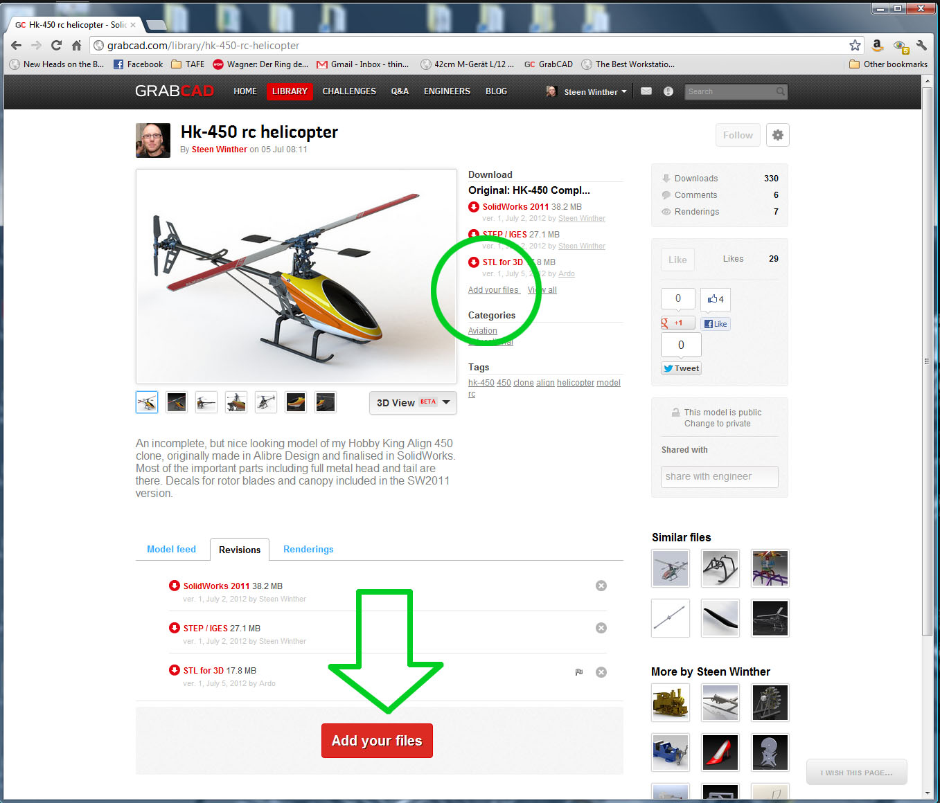 When your are logged-in and look at the model's page, you have a big red button at the bottom and a smaller link to the right of the model image, either of which will take you to the main upload page.... (See attached)