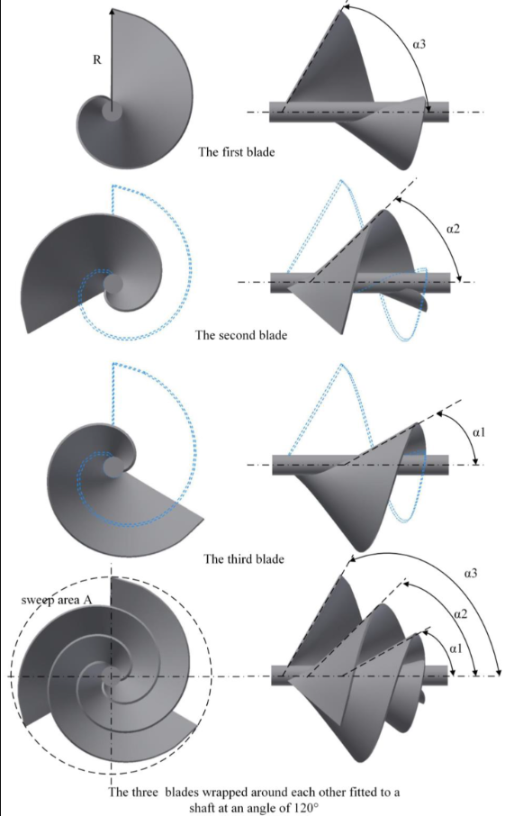 i need blade angle of archimedes spiral wind turbine have different value, like alpha 1, alpha 2, and alpha 3 is 60 degree, 45 degree, and 30 degree, same like with photos
