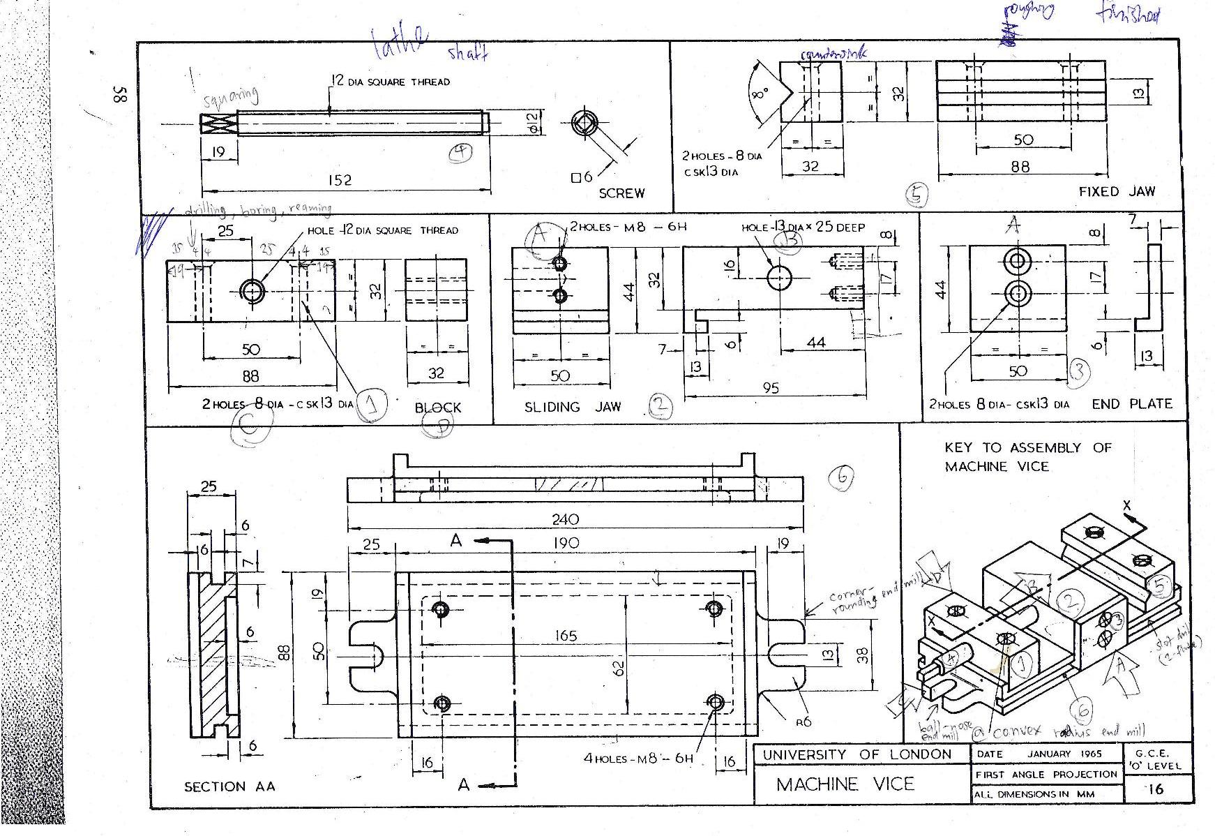 Here I attached a technical drawing of a machine vise I took from some Internet source randomly. I simply need help from all of you who are far more experienced in determining the appropriate cutting tools, their respective cutting speeds, cutter diameters, number of flutes of the cutters, feed per tooth, etc. for each of the six components of this tool steel-based machine vise. This is for my personal exercise.