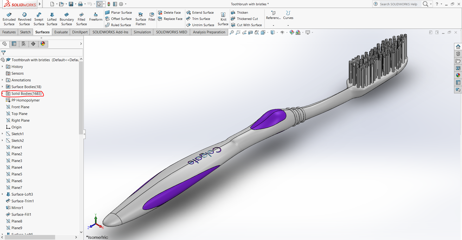 I am pretty happy with the majority of it so far but when I have tried creating the bristles it has made each bristle its own solid body,