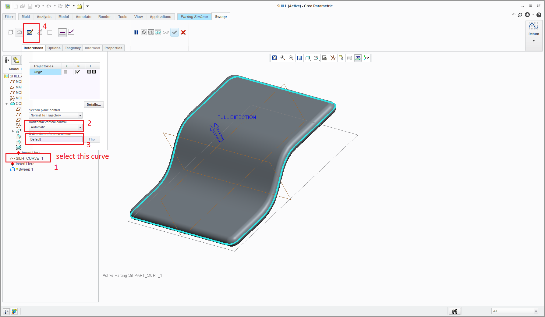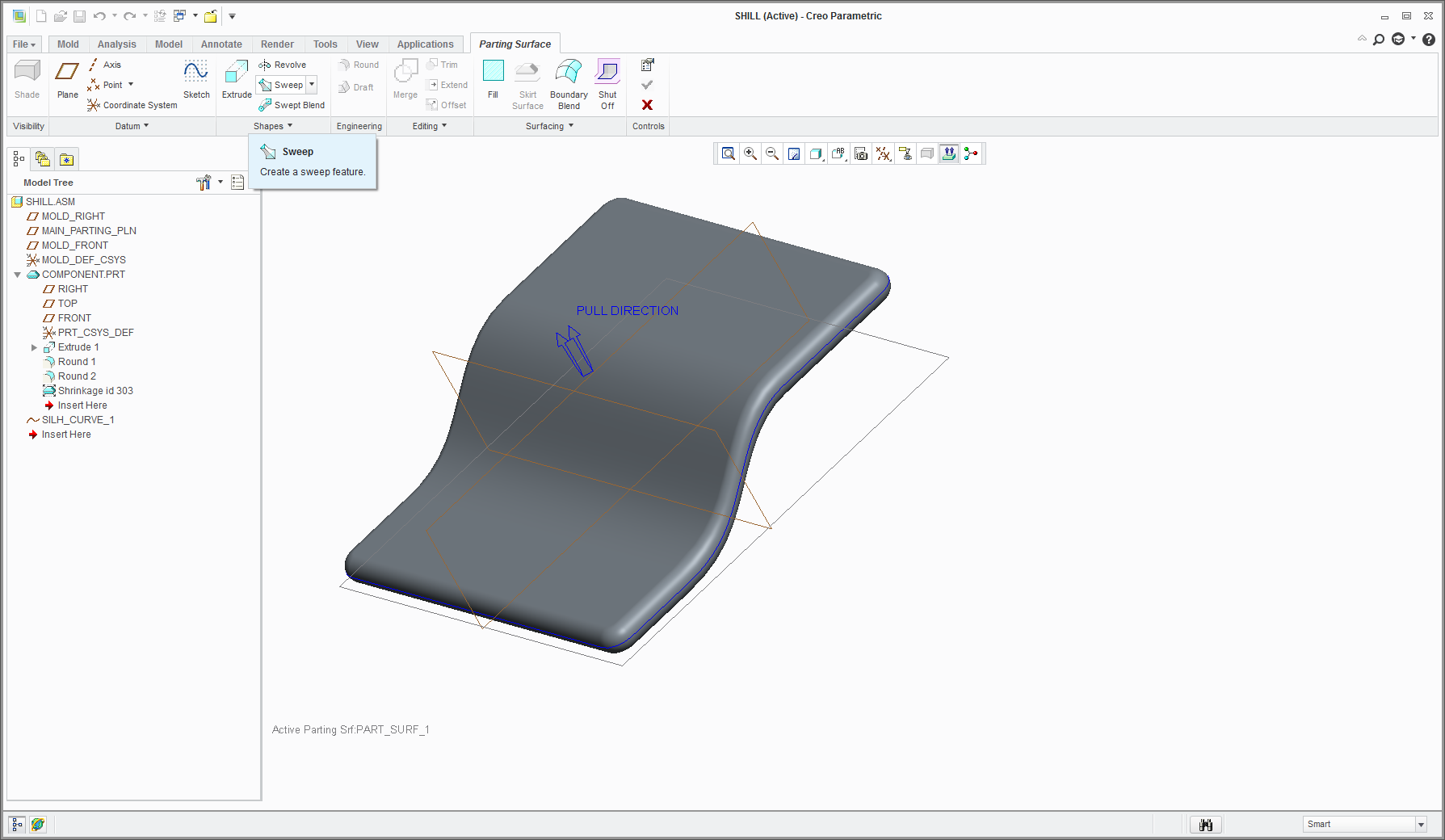 Now you need to create a parting surface from the created silhoutte curve using sweep feature as shown in the image