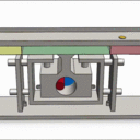 A tal efecto, en el SolidWORKS Motion se agrupó la mesa, el bastidor intermedio flotante y la excéntrica como si fuesen una sola pieza (resaltada en azul en la figura):