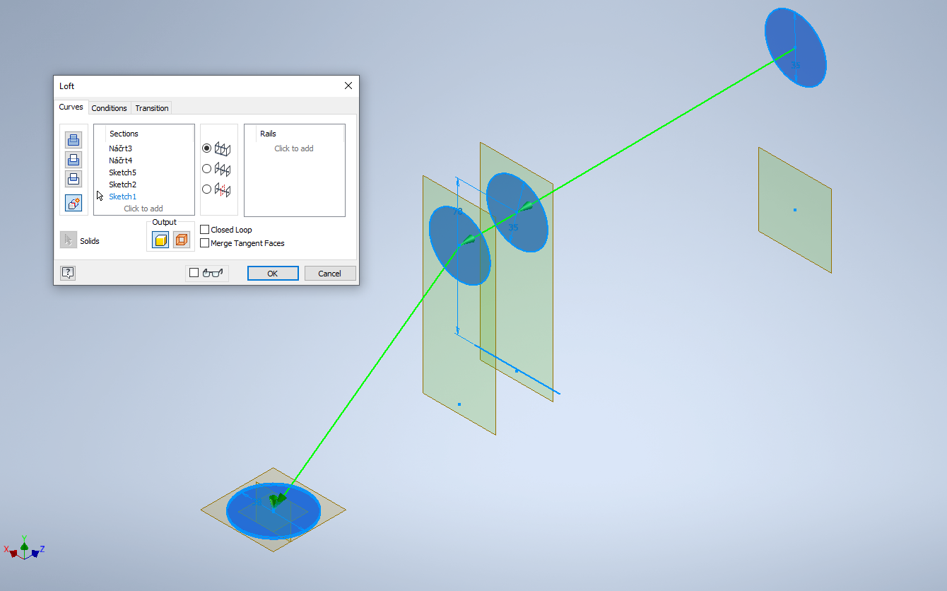 Using the Loft feature, select the 'New Solid' function (lowest from the four selections). Select the sketches that have been created (make sure to make them visible first) in order from the top to the bottom. If it is not in order, the loft may fail to be created.