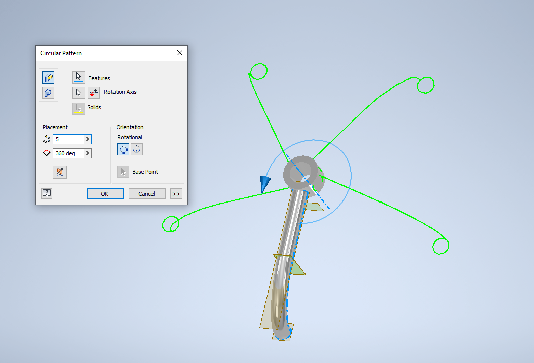 In the Placement section, enter the intended amount of repetitions along the desired angle of rotation. In this case since we want to create five total revolving legs around the center piece, we use 5 pieces and 360 degrees of rotation.