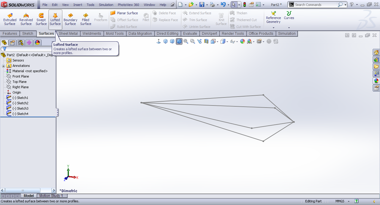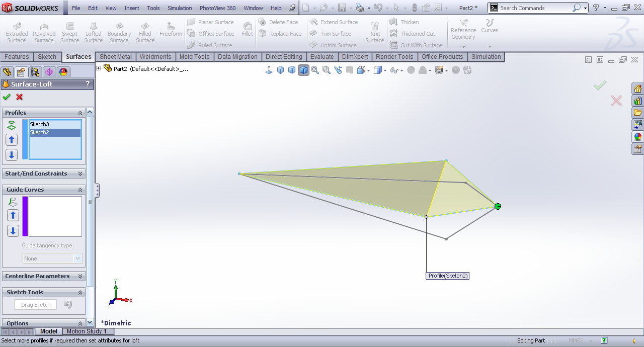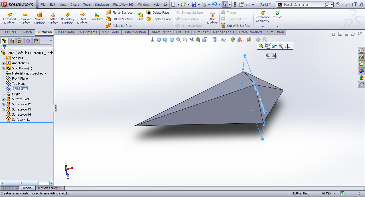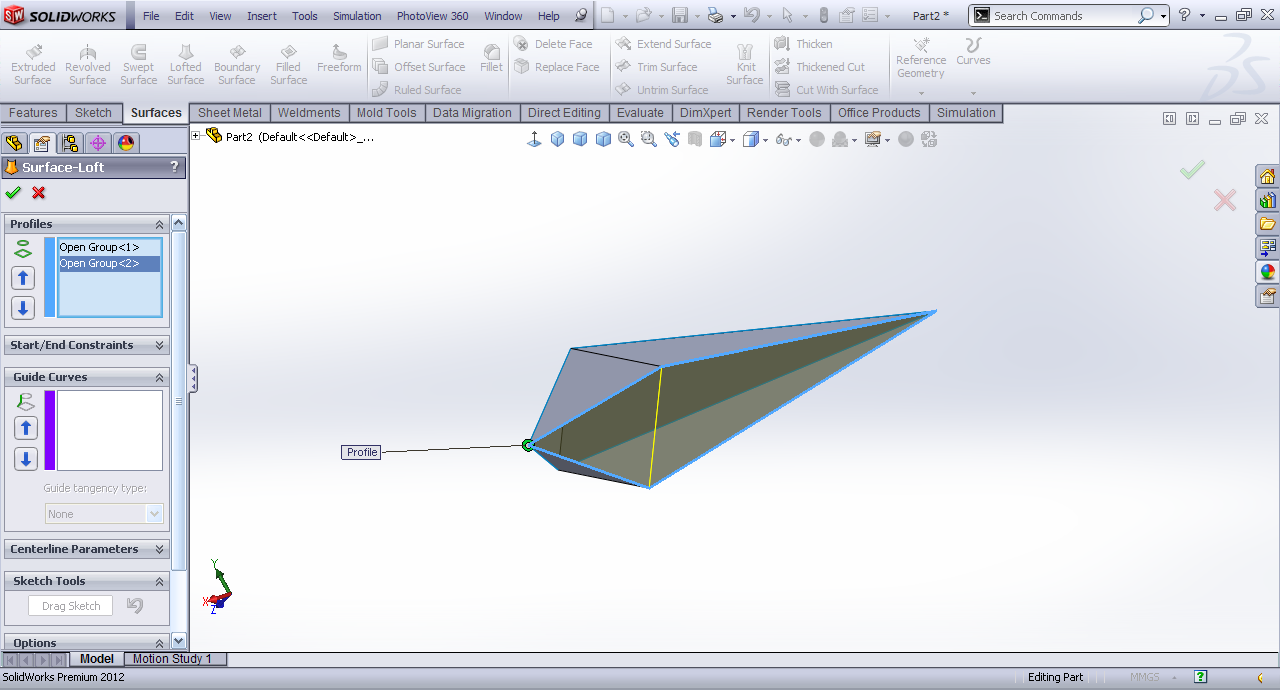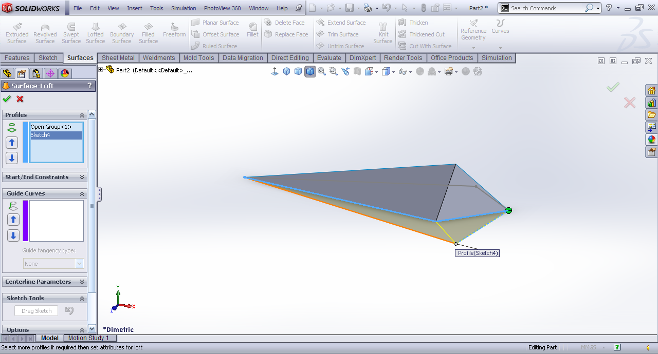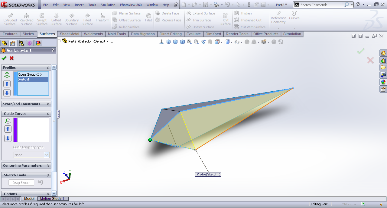 Now generate a lofted surface b/w the edge of the surface and sketch. Use selection manager to form group.